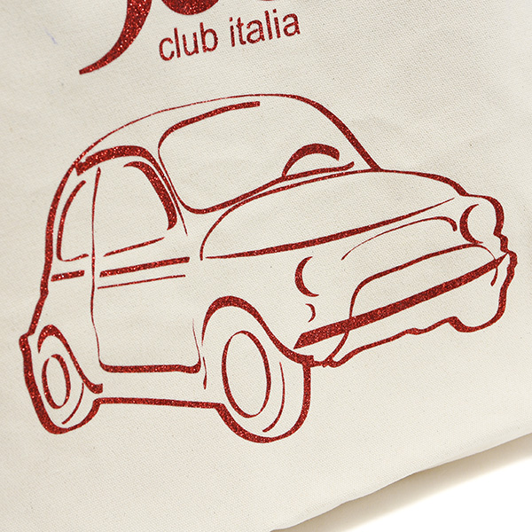 こちらは、その由緒ある500 Club Italiaのオフィシャルアイテム。優しいアイボリーカラーをベースにしたトートバッグです。正面にはクラブロゴと可愛らしいNUOVA 500のイラストがキラキラと光るラメ素材で描かれています。ロープ状の取手は、手持ちや肩がけにも優しい素材。サイズもたっぷりありますので使い勝手はバツグンです。