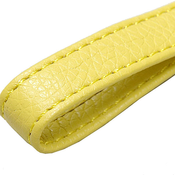 人気のストラップタイプのキーリングです。ちょっと珍しい、イエローのフェイクレザーのストラップ。リングが2本のダブルリング仕様です。上部のメタル部分にアルファロメオのエンブレムが刻印されています。