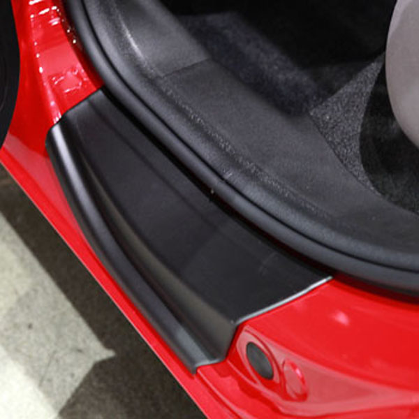 こちらは樹脂製のドアステップガード。フロントにはメタル製プレートが埋め込まれ、さり気なくアピール。ドアを開けたその瞬間、引き締まったドアステップが目に飛び込むはずです。プレート裏面に両面テープが装着済みですので取付も簡単。もちろんフィッティングもバッチリです。前後サイドシル用の4点セットです。 |