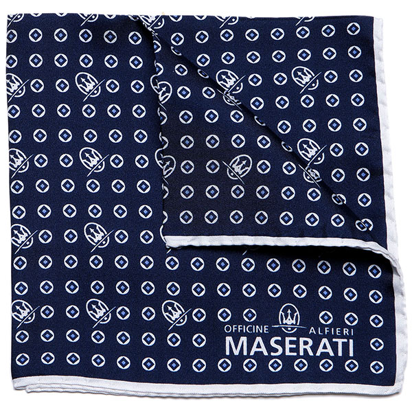 鮮やかなブルーをベースに、アジューチェックと呼ばれる幾何学模様、そしておなじみトライデントがデザインされたポケットチーフです。上質なシルク素材ならではの質感はさすがMASERATI。落ちついたデザインながら、MASERATIらしい雰囲気たっぷりに仕上がっています。