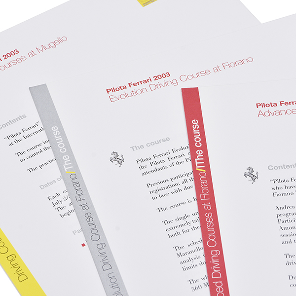 もちろんFerrariも例外ではなく、荒れ狂う跳ね馬を手懐けるプログラムが組まれています。その名は「Pilota Ferrari」。こちらはその2003年に開催された際に、参加者に用意されたガイダンスドキュメント。イエローのファイルの中には3種類のプログラムガイダンスが収められています。