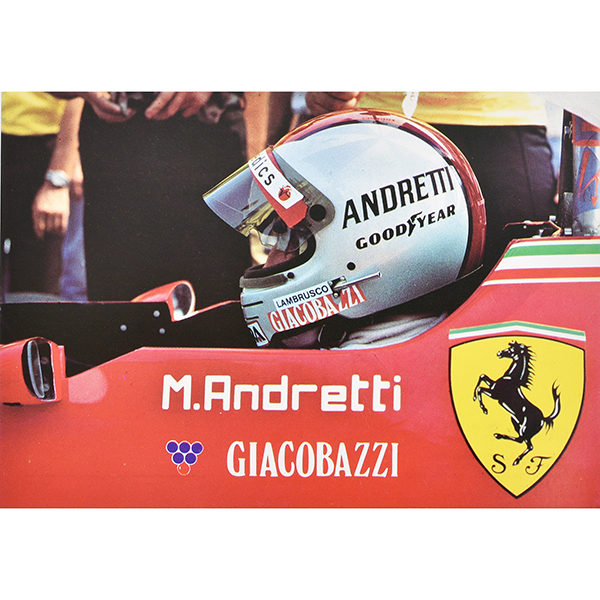 1982年、Scuderia Ferrariにとってこの年は不運のシーズンでした。ディディエ・ピローニとジル・ヴィルヌーヴ...の事故。そんな中、選ばれた一人のドライバーがM.Andretti。こちらはそのFerrari在籍時のポストカードとステッカーのセットです。ヘルメットを被りコックピットで静かに待つ姿が印象的です。カウルに記されたドライバーネーム、そしてS.Fマーク。これだけでベストショットですが、更にもう一つ注目していただきたいのは、GIACOBAZZIのロゴ。