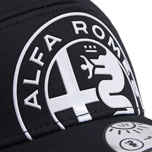 A baseball cap with a black base and a white Alfa Romeo emblem printed on POP.