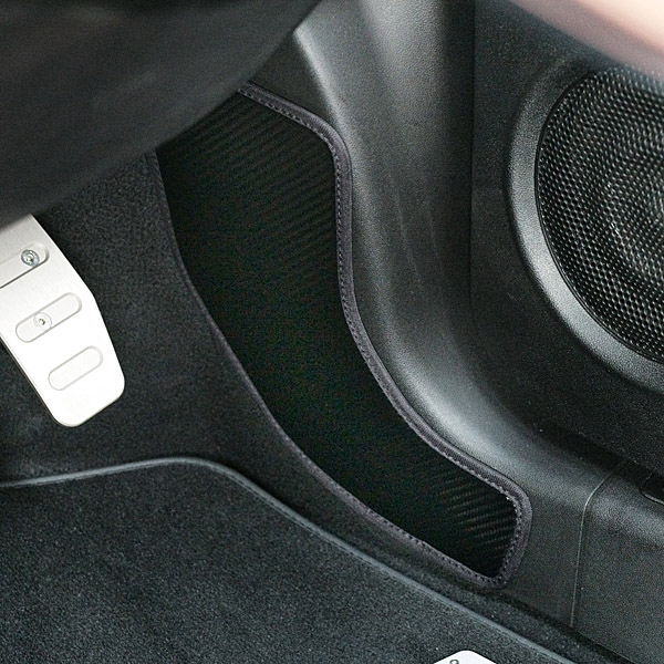表面は3D カーボン調のレザー素材を使用。裏面は4mm 厚の高密度ウレタンをラミネートしている為クッション性が高く、フットパネルに優しくフィットします。