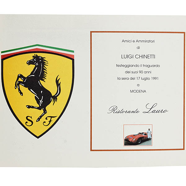 さらにこのメニューの見どころ、折目部分に印刷された小さな数字にもご注目ください。Ferrari関連のオフィシャルな出版物には必ず入る品番がここにも記載されています。つまりこのメニューはFerrariみずからが手掛けたものです。Ferrariヒストリーに決して欠くことのできない重要人物、Luigi Chinettiを身近に感じることのできるものです。すなわちそれは、Ferrariの歴史に近づくことに他なりません。Ferrariファン垂涎の逸品です。 |