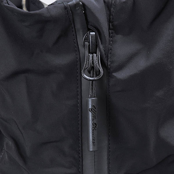 パントーンカラー426Cで漆黒に染め上げ、防水性と防風性を兼ね備えた軽量で機能的なジャケット。各所に刺し色で赤いラインが入っており、胸部にはAlfa Romeoのロゴ、左袖部分にはエンブレムがさりげなくラバープリントされ、Alfa Romeoらしい仕上がりです。